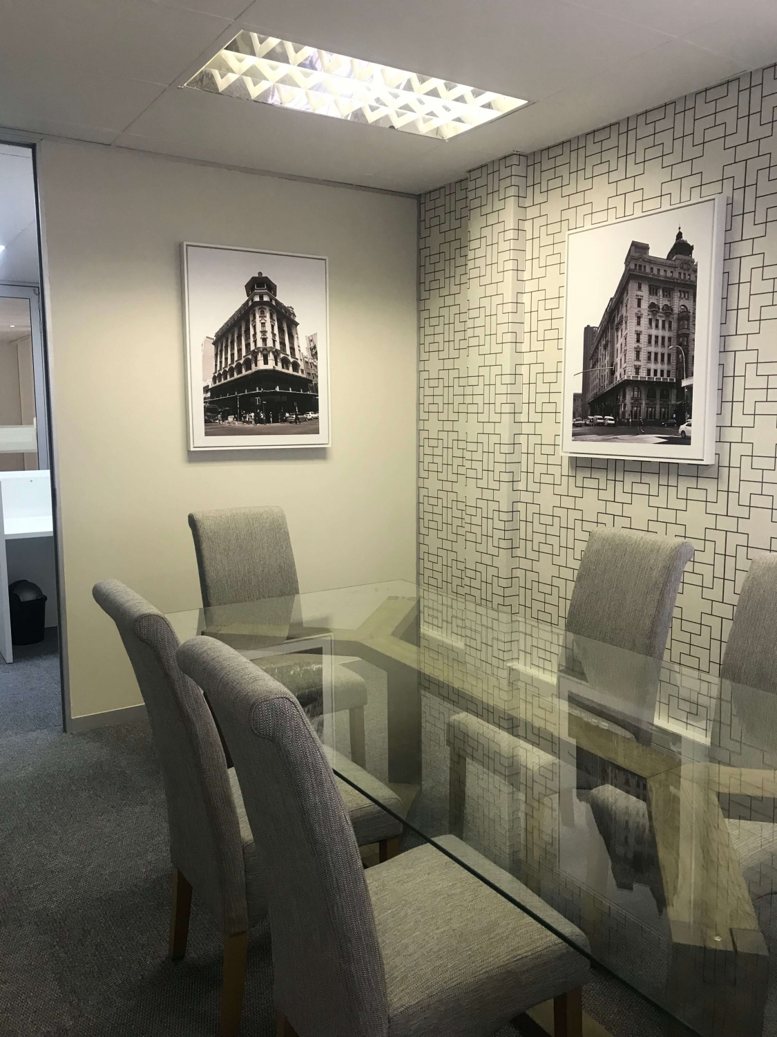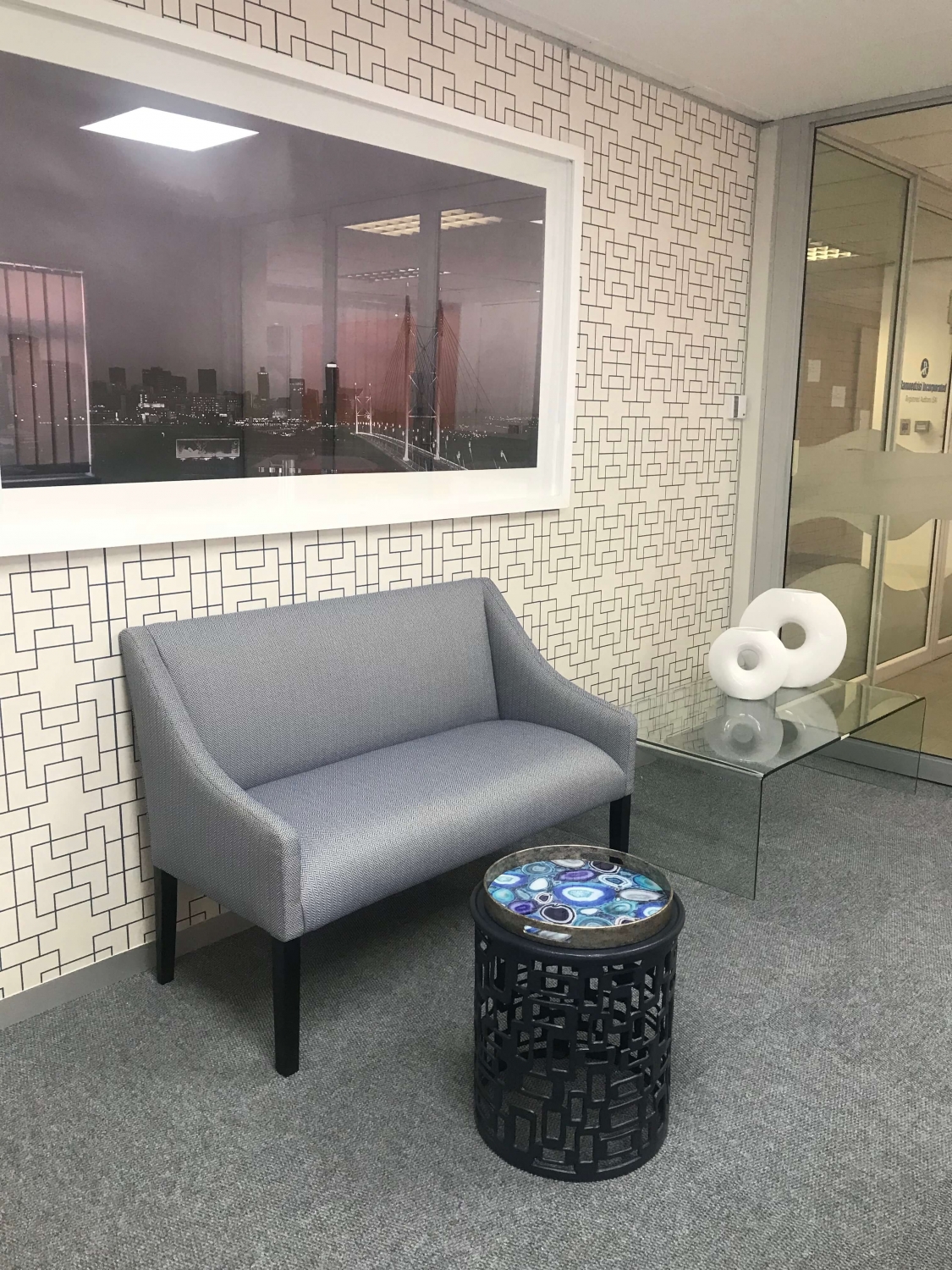 An office reception and boardrooms are the most important touch points for any business receiving client visits. NancyDesigns was commissioned to improve the reception area, as well as boardrooms for an office in Fourways, Gauteng. Corporate offices don’t need to be boring, and this specific office was lit up with a beautiful pattern wallpaper and feature prints on the walls. We included big prints of the old and new Johannesburg giving gravitas and longevity to the décor.